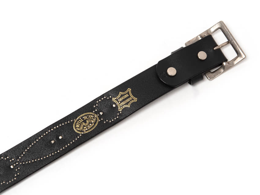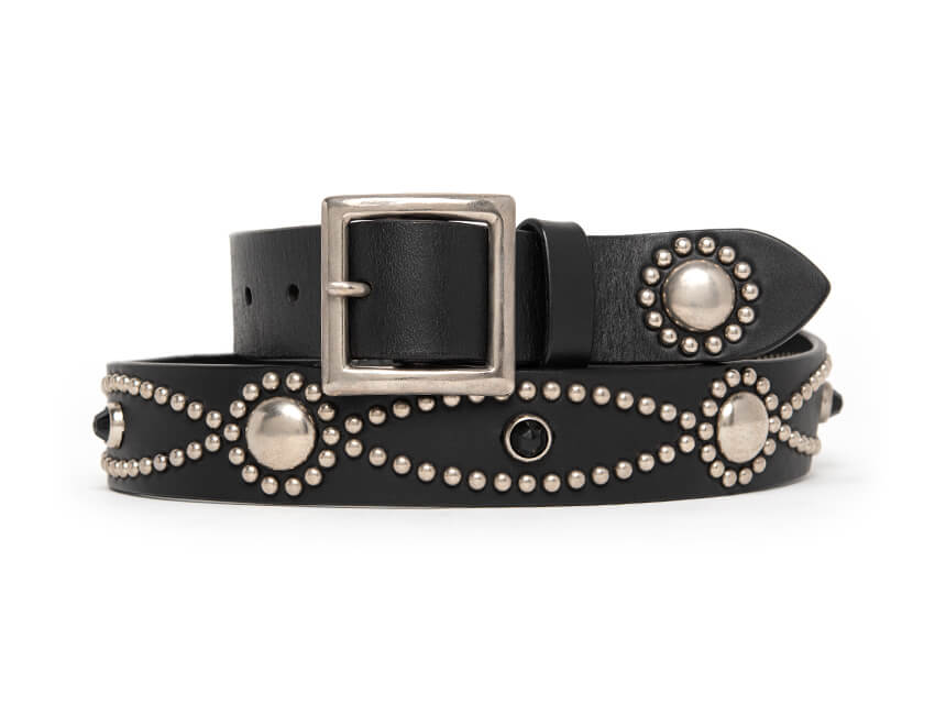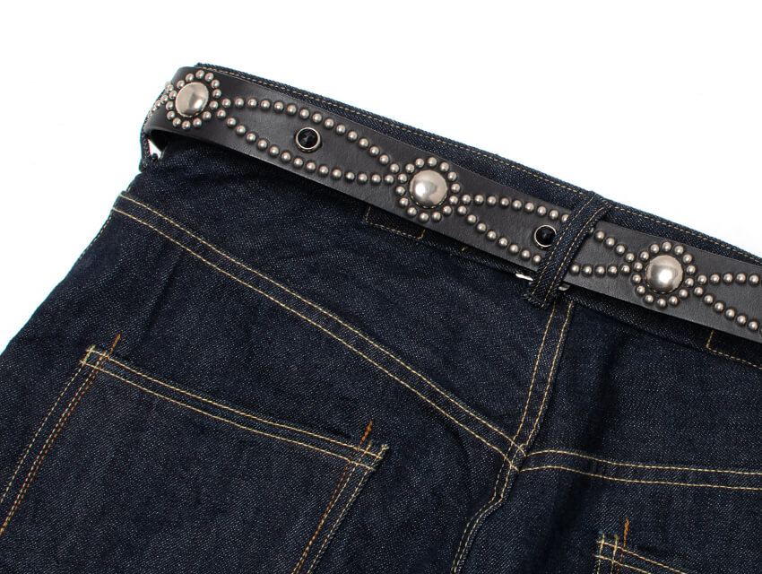 FLOWER CHAIN STUDDED BELT(34mm) LEATHER COLOR BLACK SIZE 30 inch 32 inch 34 inch 36 inch 38 inch SPEC Belt Width34mm leather thickness3.5mm MaterialSTEERHIDE BuckleNickel-plated brass DETAILS オーセンティックなフラワーモチーフである花の鎖をベルト全体にあしらいました。デニムをはじめ、様々なパンツにマッチし腰回りにインパクトを与えます。花の鎖の中央にはアクリル製のハイドームと呼ばれるヴィンテージタイプのジュエルを配置。 存在感のある表情、そしてレザーの醍醐味でもあるエイジングも楽しめる絶品に仕上がっております。使い込むほど腰回りに馴染み、艶と透明感が増していきます。スタイリングのアクセントにとてもお勧めな一本です。 ( )内はベルトホールの適応範囲になります。 SIZE 30 inch 32 inch 34 inch 36 inch 38 inch 適応甲囲 76cm(71cm ~ 81cm) 81cm(76cm ~ 86cm) 86cm(81cm ~ 91cm) 91cm(86cm ~ 96cm) 96cm(91cm ~ 101cm) 全長 93cm「101.5cm」 98cm「106.5cm」 103cm「111.5cm」 108cm「116.5cm」 113cm「121.5cm」 ( )内はベルトホールの適応範囲、「 」内はLONG BELT の全長になります。 下記の図は32inchのベルトを例とした採寸方法です。 採寸は上記図のバックルの点線のラインから真ん中の穴までの寸法です。剣先には25mmおきに5つの穴が御座います。通常W30インチのパンツをお召しになる方は、W32のベルトがベストサイズとなります。 ご使用のモニターや、環境により実際の色味、質感が異なる場合がございます。また、サイズ表記はあくまで目安となり、素材や縫製等の関係上、多少の誤差が生じる場合がございますので、予め御了承ください。 天然の革を使用している為、革本来の傷、凹凸が付いている場合もござますので、予め御了承ください。 ¥59,000yen (+TAX)