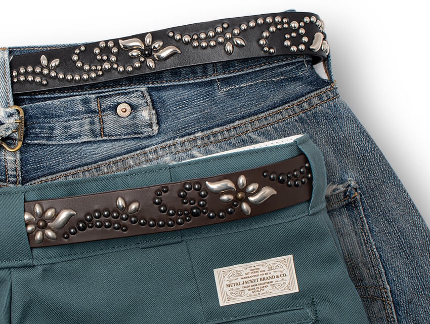LILY FLOWER STUDDED LONG BELT LEATHER COLOR BLACK CHOCO SIZE 30 inch 32 inch 34 inch 36 inch 38 inch SPEC Belt Width29mm leather thickness3.5mm MaterialSTEERHIDE Bucklebrass DETAILS 力強く咲く百合の花をスタッズワークで表現し、ベルト全体にあしらいました。通常よりも剣先を長くとりTシャツはもちろん、シャツやアウターを着てもスタッズが見えるよう設計。存在感のある表情、そしてレザーの醍醐味でもあるエイジングも楽しめる絶品に仕上がっております。使い込むほど腰回りに馴染み、艶と透明感が増していきます。スタイリングのアクセントに是非。 ( )内はベルトホールの適応範囲になります。 SIZE 30 inch 32 inch 34 inch 36 inch 38 inch 適応甲囲 76cm(71cm ~ 81cm) 81cm(76cm ~ 86cm) 86cm(81cm ~ 91cm) 91cm(86cm ~ 96cm) 96cm(91cm ~ 101cm) 全長 93cm「101.5cm」 98cm「106.5cm」 103cm「111.5cm」 108cm「116.5cm」 113cm「121.5cm」 ( )内はベルトホールの適応範囲、「 」内はLONG BELT の全長になります。 下記の図は32inchのベルトを例とした採寸方法です。 採寸は上記図のバックルの点線のラインから真ん中の穴までの寸法です。剣先には25mmおきに5つの穴が御座います。通常W30インチのパンツをお召しになる方は、W32のベルトがベストサイズとなります。 ご使用のモニターや、環境により実際の色味、質感が異なる場合がございます。また、サイズ表記はあくまで目安となり、素材や縫製等の関係上、多少の誤差が生じる場合がございますので、予め御了承ください。 天然の革を使用している為、革本来の傷、凹凸が付いている場合もござますので、予め御了承ください。 ¥56,000yen (+TAX)