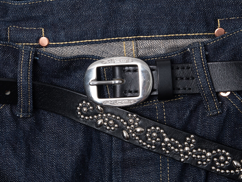 流れるような曲線が交差するスモーキングフラワーをスタッズワークで表現。植物が織りなす自然の美しさである唐草模様と煙の儚さを融合させたデザインとなります。通常よりも剣先を長くとりTシャツはもちろん、シャツやアウターを着てもスタッズが見えるよう設計。バックルはUSメイドの無垢のステンレス素材、唐草模様の彫りが入ったものを採用。存在感のある表情、そしてレザーの醍醐味でもあるエイジングも楽しめる絶品に仕上がっております。使い込むほど腰回りに馴染み、艶と透明感が増していきます。スタイリングのアクセントに是非。