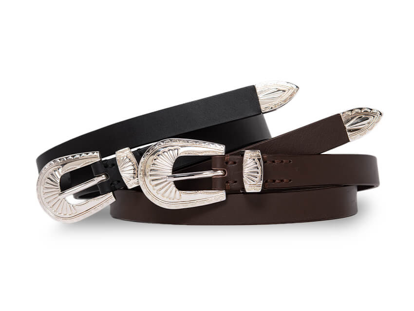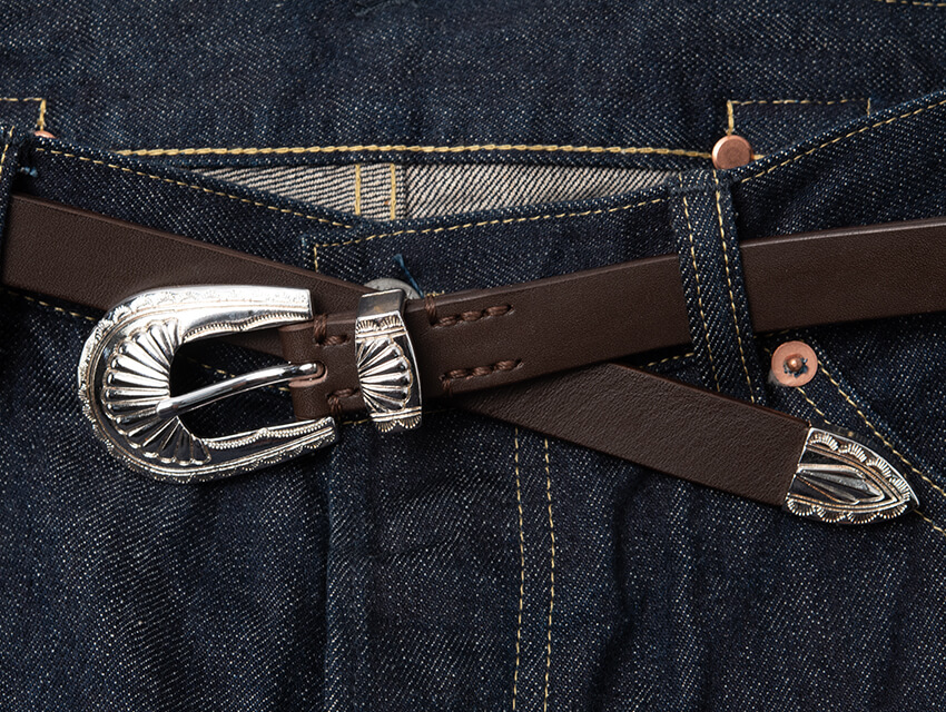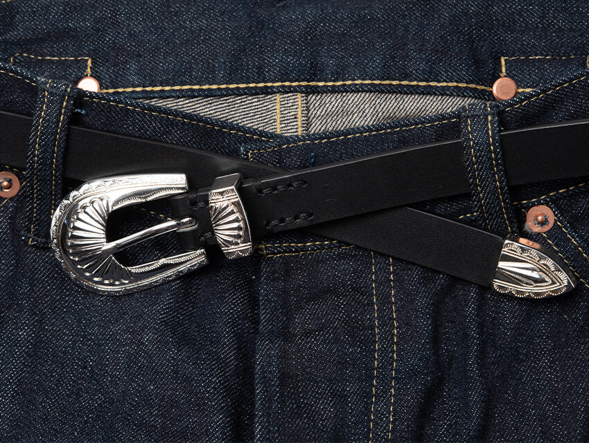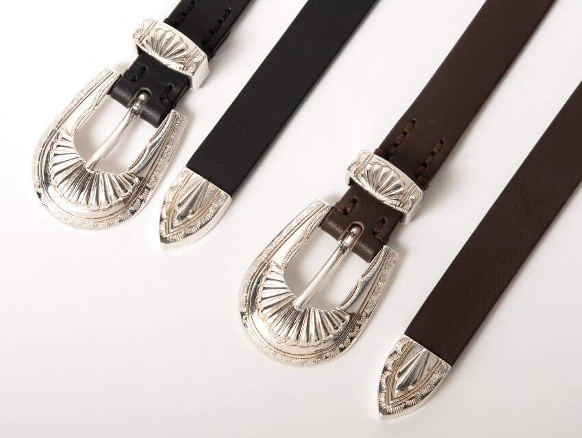 美しいサンバースト柄が彫り込んであるスリーピースのバックルを採用したナロータイプのロングベルト。
