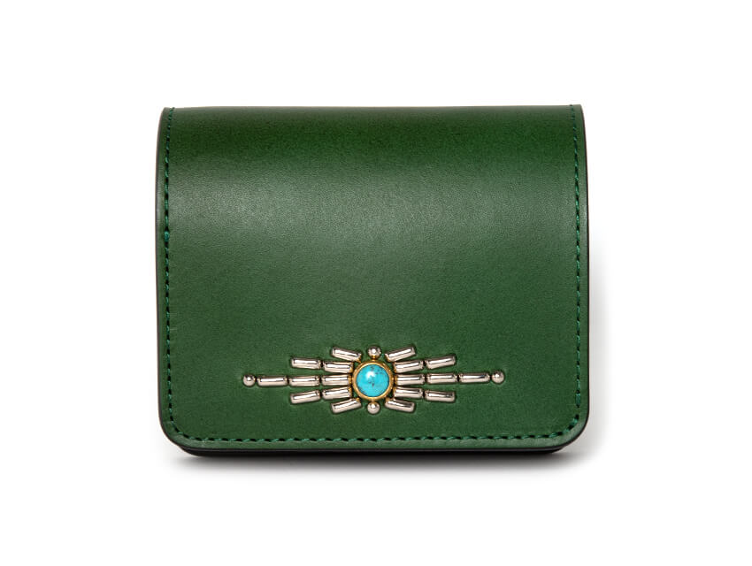 「大空を羽ばたく鷲」をイメージし装飾されたEAGLE&JEWEL SERIESのミニ財布、EAGLE&JEWEL COMPACT WALLET(EYELET TYPE)です。ウォレットの顔となるイーグルの中心部分には天然石であるターコイズを配置。