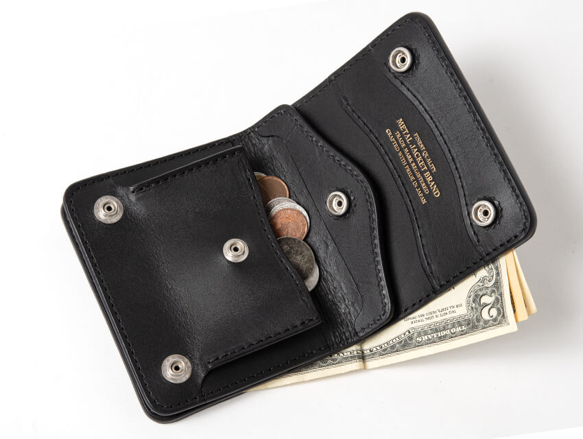 札室1室、フラップ付コインポケット1室、カードポケット2室となっており、コンパクトなサイズ感と充実した機能を装備。ゆとりのあるコインポケットの背面にはカードがまとめて収納可能なオープンポケットも備わり、お札も折らずに収納可能で小さいながらも機能が充実したミニ財布です。存在感のある表情、そしてレザーの醍醐味でもあるエイジングも楽しめる絶品に仕上がっております。使い込むほど手に馴染み、艶と透明感が増していきます。