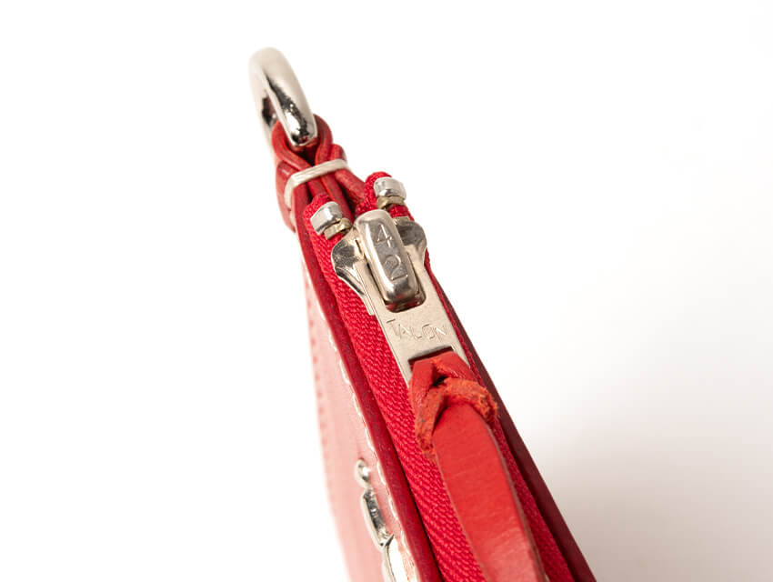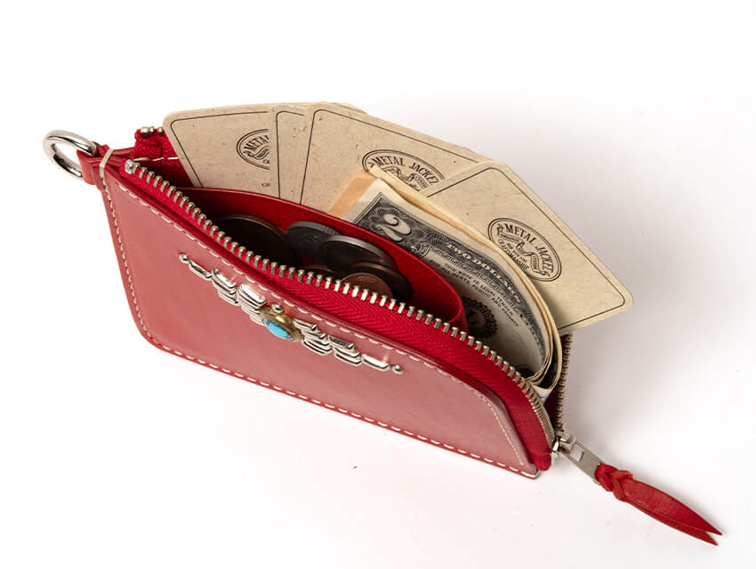 ベースとなるのは手のひらのおさまるシンプルな形のショートジップウォレットのDカン付きタイプ。頑丈で時間とともに馴染む革。ファスナーを開けば大きなポケットと二つのスペース。シンプルな作りですが、紙幣も小銭もカードも収納できます。L字のファスナーは大きく開くので中身の取り出しも容易。最小限でかつ十分な機能性を持った財布です。