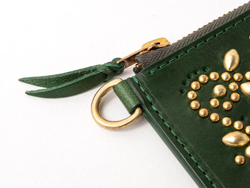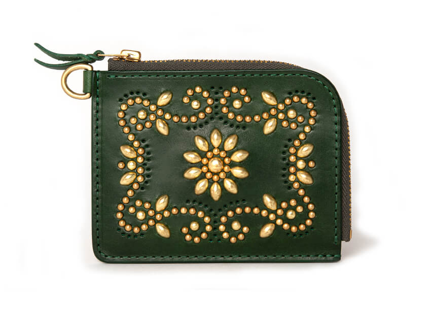 流れるような曲線が美しい唐草模様と花をスタッズで表現。ポイントとなるのはメダリオンとの融合。大胆ながらもシャープな印象に拘り独特な雰囲気を併せ持つデザインが誕生いたしました。