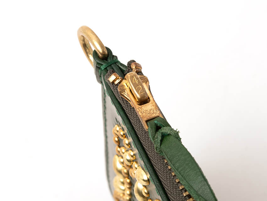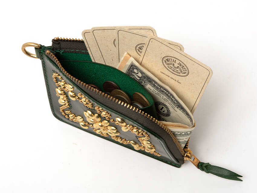 ベースとなるのは手のひらのおさまるシンプルな形のショートジップウォレットのDカン付きタイプです。頑丈で時間とともに馴染む革。ファスナーを開けば大きなポケットと二つのスペース。シンプルな作りですが、紙幣も小銭もカードも収納できます。L字のファスナーは大きく開くので中身の取り出しも容易。最小限でかつ十分な機能性を持った財布です。